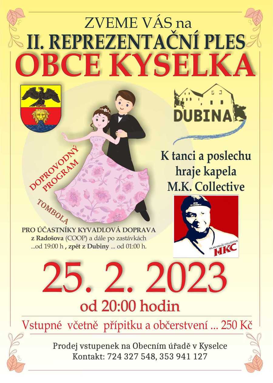 Obec Kyselka pořádá dne 25. 2. 2023 od 20h "II. Reprezentační ples obce Kyselka". Místem konání je Hospoda Dubina. Pro návštěvníky zajištěna kyvadlová doprava Kyselka - Dubina. K tanci a poslechu zahraje skupina M.K. Collective. Chybět nebude doprovodný program, fotokoutek a tombola. Vstupenky v ceně 250 Kč si rezervujte na tel. čísle 724 327 548.