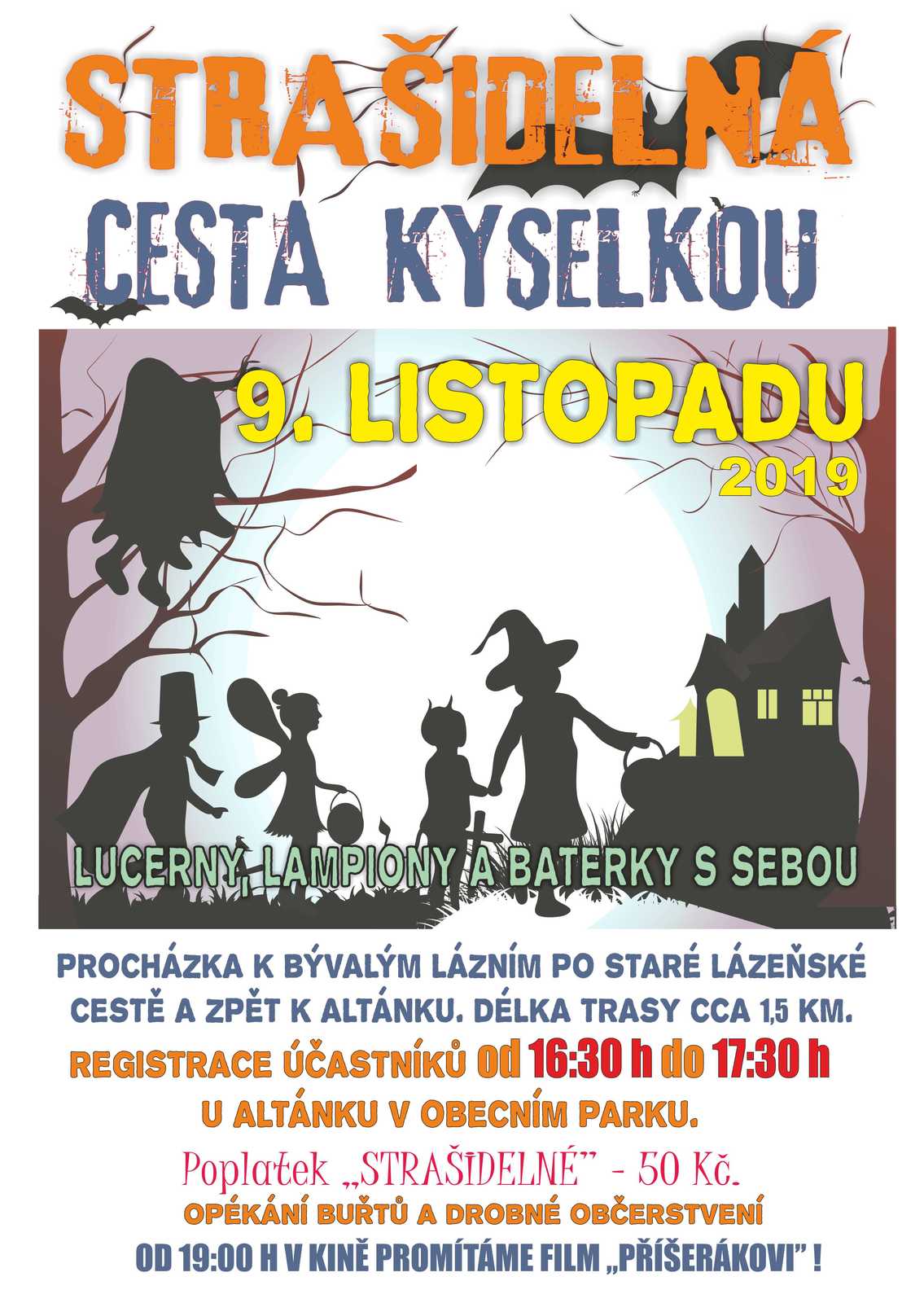 strasidelna cesta 2019.jpgObec Kyselka srdečně zve děti a rodiče na další ročník Strašidelné cesty Kyselkou. Sraz u altánu v kyselském parku  dne 9. 11. 2019. Registrace bude probíhat od 16:30h do 17:30h. Poplatek "STRAŠIDELNÉ" - 50 Kč. Na cestu bodou návštěvníci vypravovány postupně, tak aby nedocházelo k hromadění u jednotlivých strašidelných zastavení. Doporučujeme vybavit se lucernou, lampionem nebo baterkou a také se můžete i strašidelně vyparádit. Ti, kteří se z cesty vrátí si pak mohou opéci buřtík a jinak se občerstvit. Máme přislíbenou účast mnoha strašidel a tajemných bytostí, takže se máte opravdu na co těšit.
