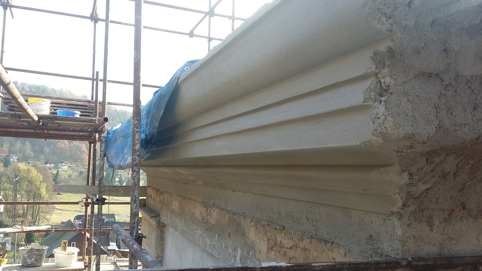 výhradně tradiční technologie. Tvary zdobných říms jsou obnovovány podle výsledků historických průzkumů. Práce jsou prováděny za finanční podpory Ministerstva kultury.